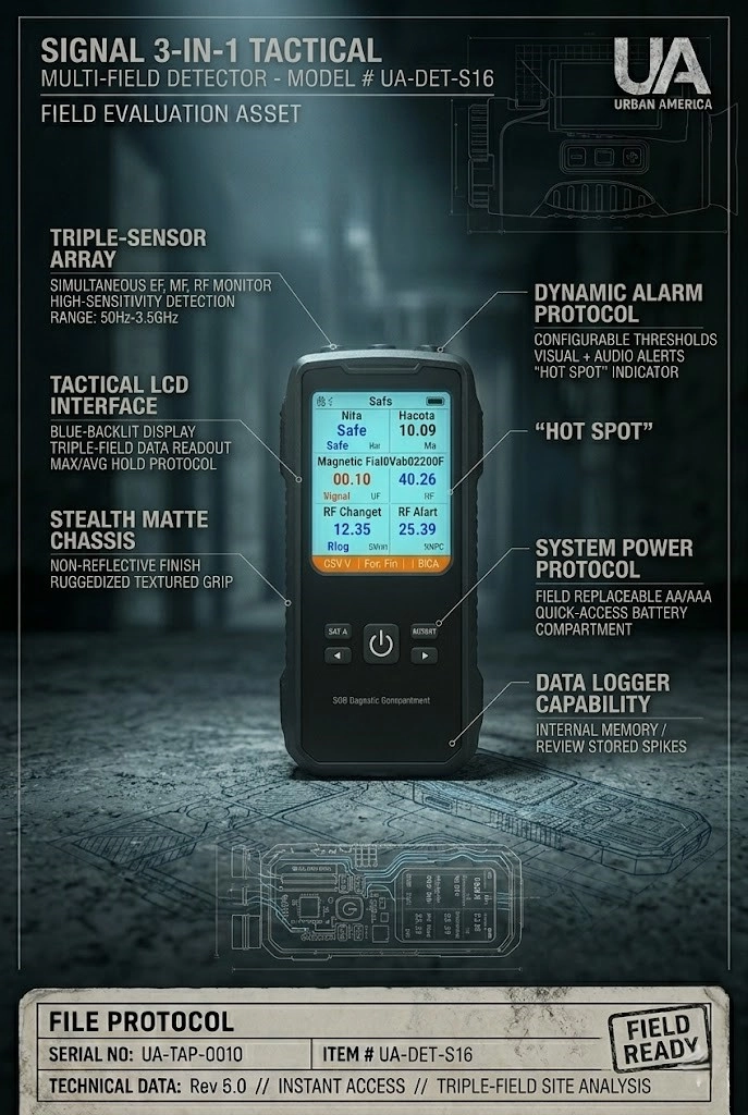 True investigation requires more than just a feeling; it requires data. The “Signal” Multi-Field Detector is a high-precision, 3-in-1 tactical instrument engineered to monitor Electric Fields (EF), Magnetic Fields (MF), and Radio Frequency (RF) signatures simultaneously.