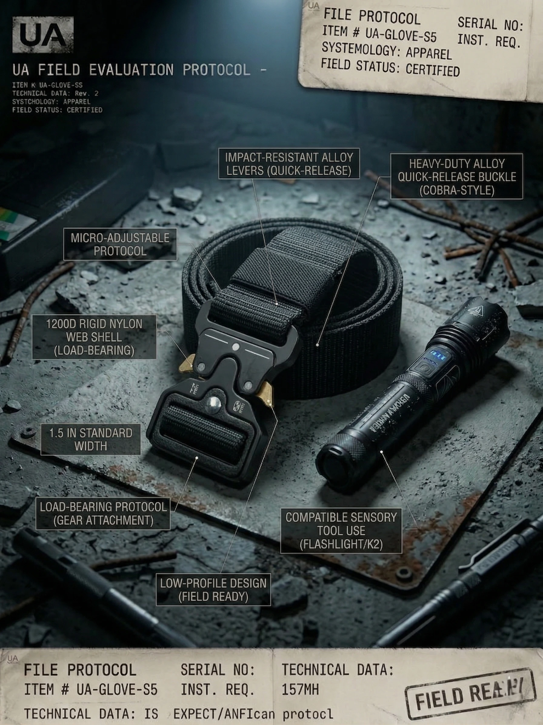 1200D Rigid Nylon Webbing: Stiff enough to support holsters, heavy flashlights, and K2 meters without sagging or twisting.